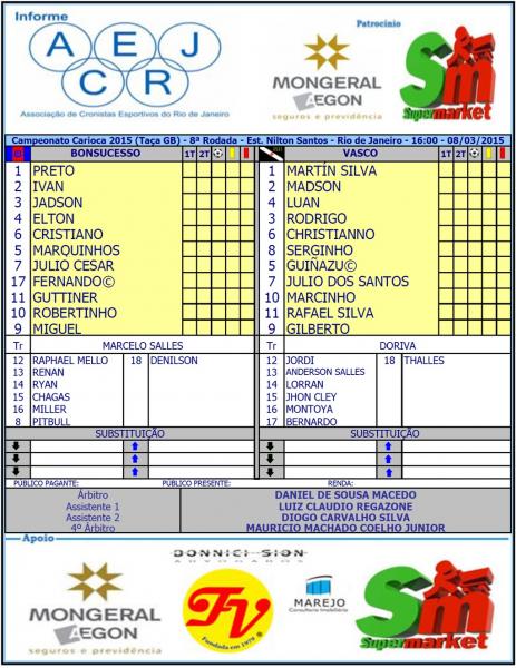 Escalação do Vasco:Martín Silva, Madson, Rodrigo, Luan, Christianno, Guiñazu,Serginho, Julio dos Santos, Marcinho, Rafael Silva e Gilberto.