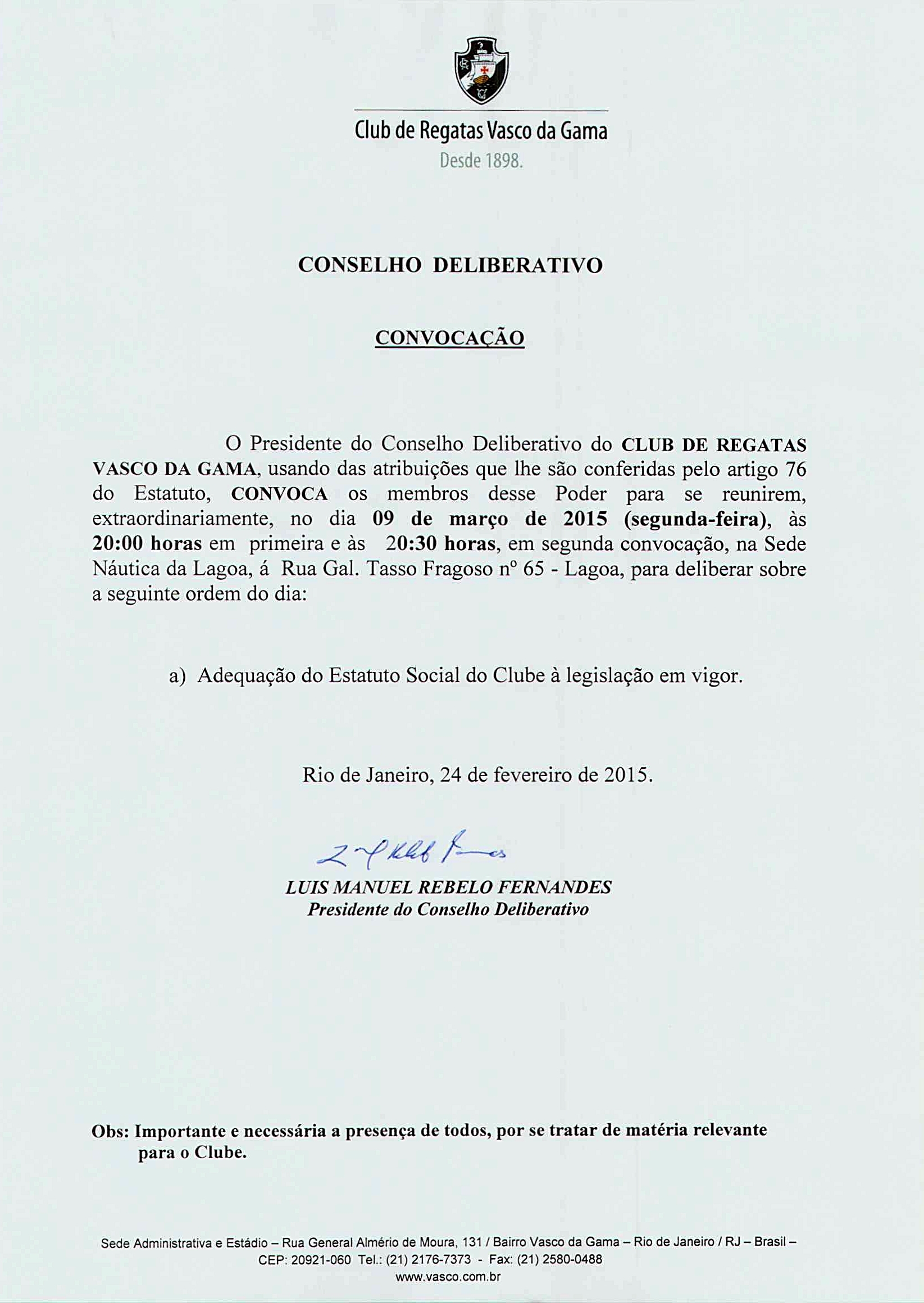 O Conselho Deliberativo do Vasco se reúne na noite desta 2ª-feira (09/03), na sede da Lagoa, para discutir a adequação do Estatuto à legislação em vigor. Veja a convocação: