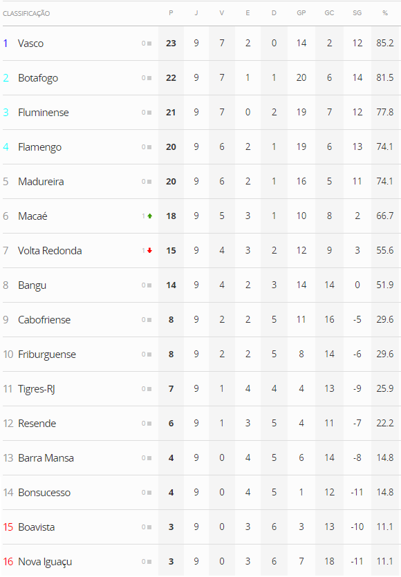 Terminada a 9ª rodada da Taça Guanabara, o Vasco, que derrotou o Resende por 1 a 0, manteve-se na liderança da competição e segue 1 ponto à frente do vice-líder Botafogo. O Gigante da Colina é o único clube ainda invicto no Campeonato Estadual.