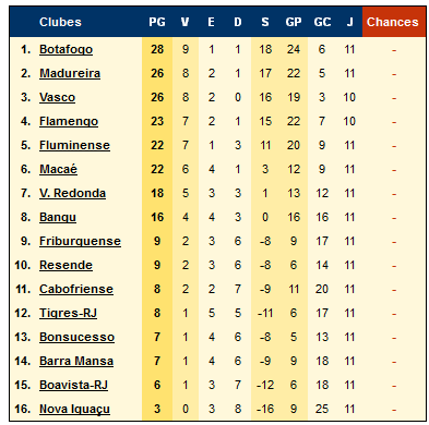 Confira a classificação provisória da 11ª rodada da Taça Guanabara: