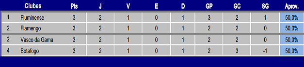 A derrota do Vasco para o Flamengo por 2 a 1 embolou de vez o Torneio Super Clássicos. Agora, os 4 times têm 3 pontos. O Fluminense lidera devido ao saldo de gols. O Vasco está empatado com o Flamengo em pontos, vitórias, saldo de gols e gols pró, mas perde no confronto direto.