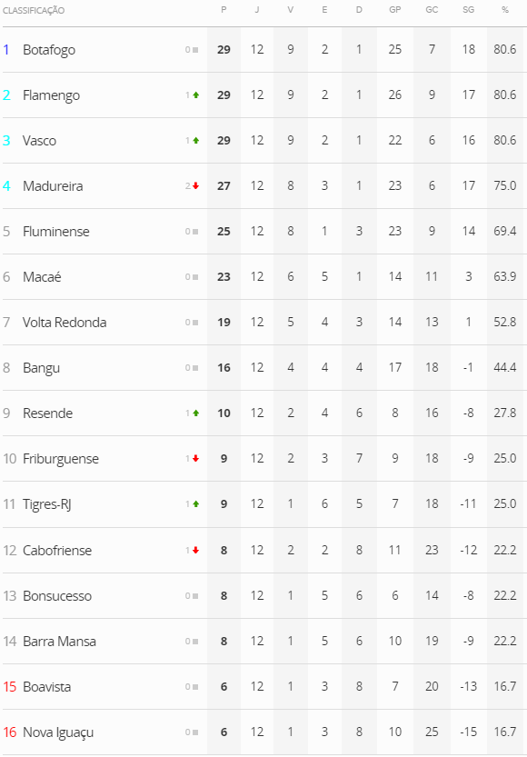 Terminada a 12ª rodada da Taça Guanabara, o Vasco, que derrotou o Boavista por 2 a 1, subiu da 4ª para a 3ª colocação na tabela. O Gigante da Colina tem o mesmo número de pontos do líder Botafogo e 4 a mais do que o 5º colocado, que é o Fluminense.