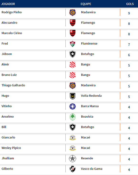 Com 4 gols, Gilberto está em 10º lugar na artilharia, que é liderada por Rodrigo Pinho, do Madureira, que tem 9 gols.