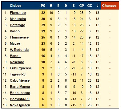 Flamengo e Madureira venceram seus jogos neste sábado (28/03) e alcançaram o 1º e o 2º lugar na classificação do Estadual. O Vasco pode chegar ao mesmo número de pontos do líder se vencer o Botafogo no clássico deste domingo. Caso vença por 4 gols de diferença, o Vasco alcança a liderança.