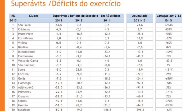 O ranking se inverte e os clubes aparecem nas primeiras posições em matéria de dívidas. Neste quesito, Botafogo e Vasco ganham a companhia de Flamengo e Fluminense no top 5. O rubro-negro liderou a lista das dívidas totais dos clubes em 2013, com R$ 757, 4 milhões. A diretoria alega que já reduziu o valor para R$ 570 milhões. Em seguida, vem o Botafogo, com R$ 699,3 milhões. O Vasco é terceiro, com R$ 518,4 milhões, enquanto o Fluminense aparece na quinta posição, com R$ 422,7 milhões.