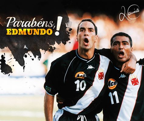 Descrição da Imagem #PraCegoVer: foto de Romário ao lado de Edmundo. Os dois estão abraçados e vestem a camisa do Vasco. Ambos estão com a boca aberta, em sinal de grito de comemoração. Do lado esquerdo da imagem, há um fundo em aquarela preto. Sobre o fundo, está escrita a frase "Parabéns, Edmundo!".