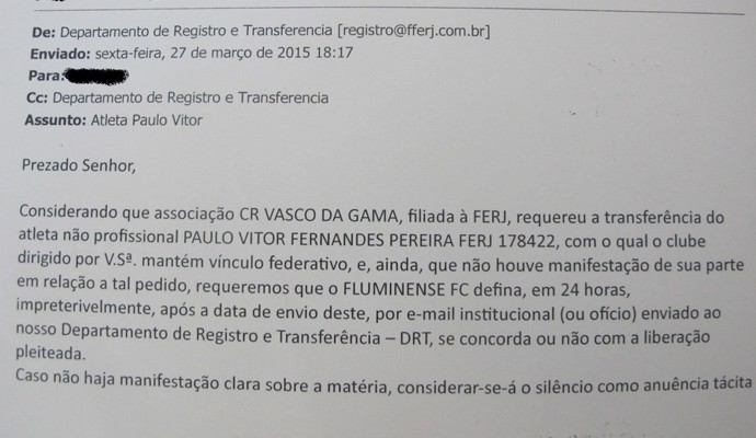Nos bastidores, a disputa entre Fluminense e Vasco pelo atacante Paulo Vitor, de 15 anos, ganhou mais capítulos. Desta vez, a Federação de Futebol do Rio de Janeiro (Ferj) foi a intermediária e pressionou o Tricolor através de um e-mail que o GloboEsporte.com teve acesso. O texto diz que o clube vascaíno solicitou a transferência do atleta e que, caso a diretoria do Flu não respondesse em 24h, a Ferj entenderia como anuência e faria a inscrição de Paulo Vitor.