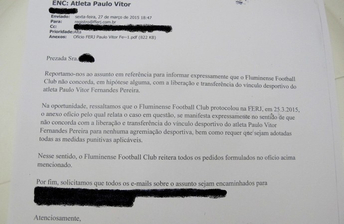 ![]() Email de resposta do Flu sobre a condição de Paulo Vitor |