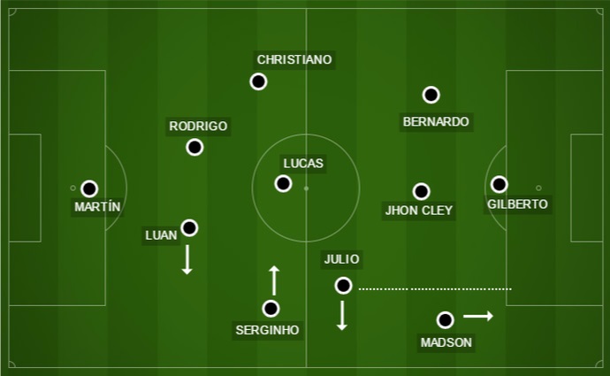 Com aval de Doriva, a movimentação ofensiva de Madson mexe ainda no meio de campo e na defesa. Principal municiador de Madson, Julio dos Santos passa boa parte do jogo mais recuado que Madson, justamente para abrir espaço para o camisa 2 avançar. Na zaga, Luan também fica atento para os passes no retorno do lateral baiano, que já teve Marcelo Cirino e Everton, do Flamengo, e Jobson, às suas costas para explorar o lado de Madson.