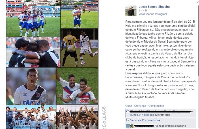 "Para sempre vou me lembrar deste 5 de abril de 2015! Hoje é a primeira vez que vou jogar uma partida oficial contra o Friburguense. Não é segredo pra ninguém a identificação que tenho com o Frizão e com a cidade de Nova Friburgo. Afinal, foram mais de dez anos defendendo o Tricolor da Serra! Sou muito grato por tudo o que passei aqui! Mas hoje, estou vivendo um outro sonho, realizando um grande objetivo na minha vida, que é vestir a camisa do Vasco da Gama. Um clube de tradição e respeitado no mundo inteiro! Hoje está passando um filme na minha cabeça! Sempre tive certeza que todo aquele esforço e dedicação valeriam a pena!