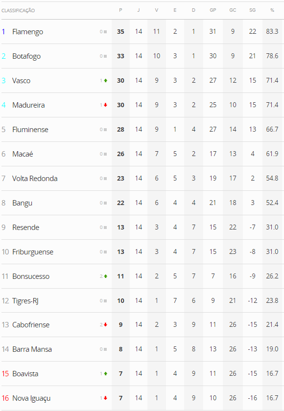 Terminada a 14ª e penúltima rodada da Taça Guanabara, o Vasco, que foi derrotado pelo Friburguense por 5 a 4, subiu da 4ª para a 3ª colocação na tabela. O Gigante da Colina está 5 pontos atrás do líder Flamengo (não tendo, portanto, mais chance de título) e 2 à frente do 5º colocado, que é o Fluminense.