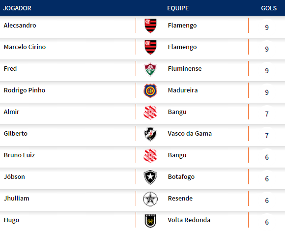 Com 7 gols, Gilberto está em 5º lugar na artilharia, que é liderada por Rodrigo Pinho, do Madureira, Fred, do Fluminense, Marcelo Cirino, do Flamengo, e Alecsandro, do Flamengo, que têm 9 gols.