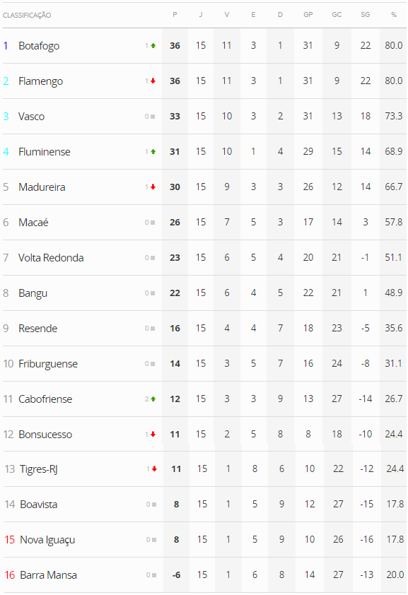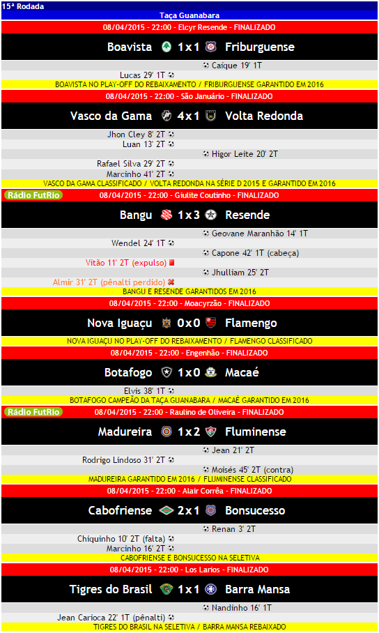 Terminada a 15ª e última rodada da Taça Guanabara 2015, o Vasco, que derrotou o Volta Redonda por 4 a 1, manteve-se em 3º lugar na tabela, terminando a competição nesta colocação e garantido classificação às semifinais do Campeonato Estadual.