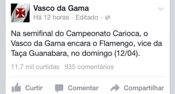 No Facebook, Vasco 'lembra' que Urubu foi vice da Taça Guanabara