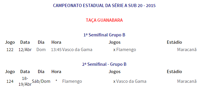 Vasco e Flamengo se enfrentarão num jogo decisivo no domingo (12/04) também nos Juniores. Os rivais farão o jogo de ida das semifinais da Taça Guanabara às 13h45, no Maracanã, na preliminar dos profssionais, o que será repetido no jogo da volta, no domingo seguinte. A outra semifinal reúne Botafogo e Fluminense. Ao contrário do Campeonato Estadual dos profissionais, o dos juniores tem as Taças GB e Rio, cada uma delas com semifinais e finais, e os campeões de cada taça se enfrentam na decisão. A competição tem seu término previsto para 25 de julho.