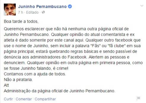 Queremos esclarecer que não há nenhuma outra página oficial de Juninho Pernambucano. Qualquer opinião do atual comentarista e ex atleta é dado somente por este canal aqui. Qualquer outro facebook que use o nome de Juninho, sem incluir a palavra "Fãs" ou "fã clube" em sua página principal, estará quebrando regras básicas e sendo passível de denúncia aos administradores do Facebook. Alertem as pessoas e denunciem. Qualquer opinião em outra página em primeira pessoa, como se fosse Juninho falando, é crime!