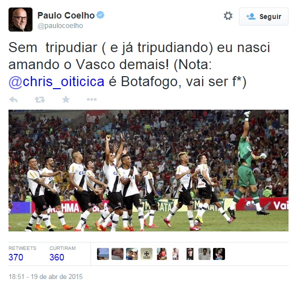 No Twitter, Paulo Coelho exalta o Vasco citando versão feita pela torcida de música sua: 'Eu nasci amando o Vasco demais'
