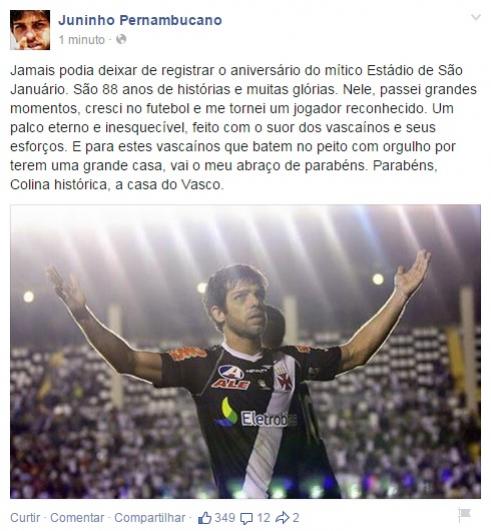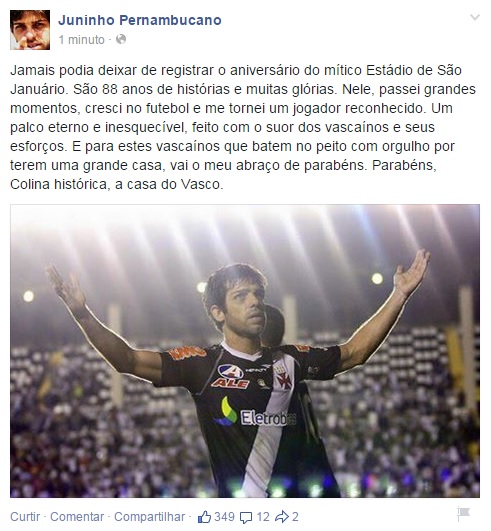 Juninho Pernambucano também exalta São Januário nos 88 anos da inauguração do estádio