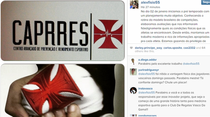 No dia 02 de janeiro iniciamos a pré temporada com um planejamento muito objetivo. Conhecendo a rotina do modelo brasileiro de competições, elaboramos avaliações que nos informaram fidedignamente quais as condições físicas que os atletas se encontravam. Desde então, montamos um trabalho moderno e rico de informações apropriadas pra cada atleta. Estamos gozando do privilégio de ter sofrido apenas uma lesão muscular (diagnosticada por imagem) desde a pré temporada. Sendo assim os treinos e jogos puderam ser praticados com saúde. Lembro que ninguém pode responder pelo Clube de Regatas Vasco da Gama que de forma científica e prática organiza suas atividades. Ressalto que o campeonato carioca foi uma excelente oportunidade para ajustar a parte física do time. Os trabalhos continuam com plantão 24 horas do CAPRRES. (Ainda é só o começo)