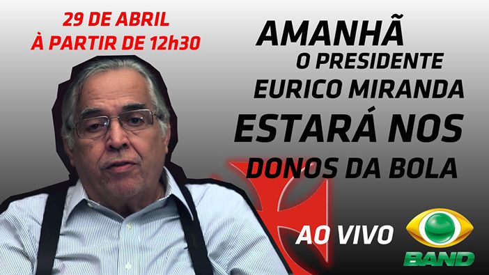 Eurico participa do programa 'Os Donos da Bola Rio', da Band Rio, nesta 4ª às 12h30