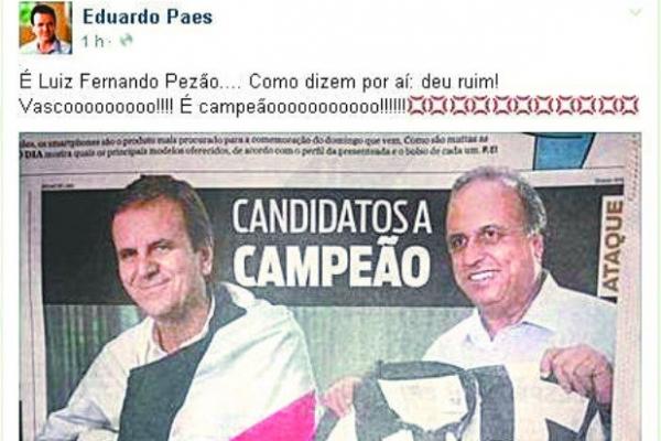 Eduardo Paes venceu uma ‘briga’ particular com Luiz Fernando Pezão. E escancarou tudo em uma rede social. Torcedor fanático do Vasco da Gama, o prefeito usou o Facebook para comemorar a conquista do título do time cruzmaltino em cima do Botafogo, clube do atual governador. Ele chegou até mesmo a postar a capa da edição de domingo do DIA .