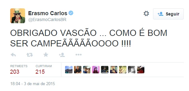 Erasmo Carlos: 'Obrigado Vascão! Como é bom ser campeão!'