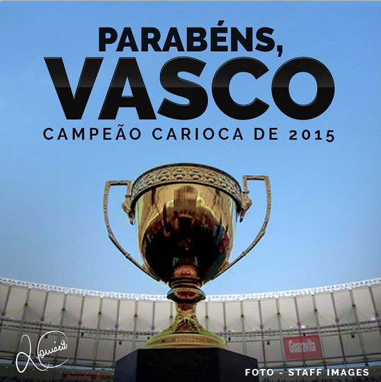Descrição da imagem #pracegover: foto da taça dourada, de dentro do Maracanã, com o céu azul ao fundo. Sobre o céu, está escrito: "Parabéns, Vasco. Campeão Carioca de 2015"