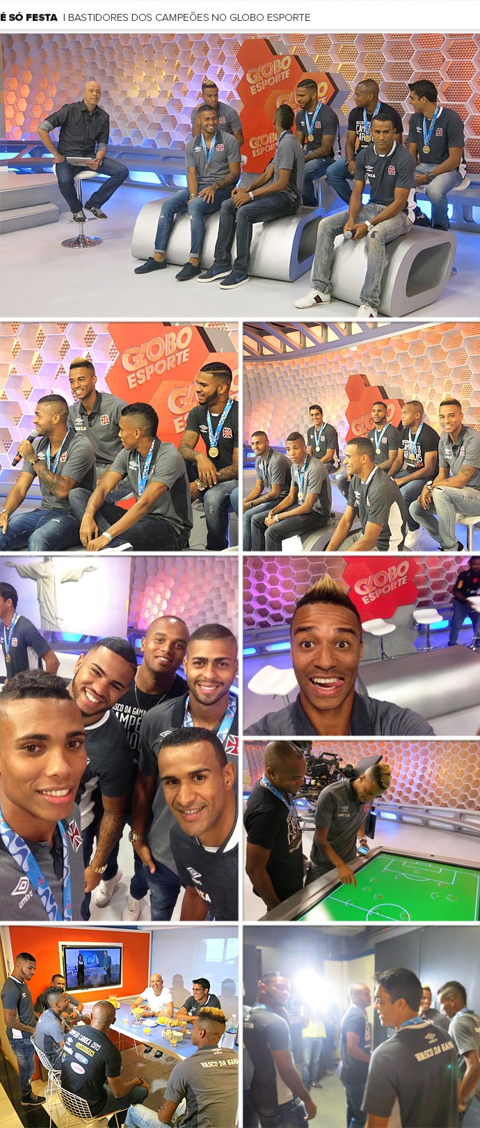 Parte do elenco campeão carioca não teve sossego nesta segunda-feira. Horas depois de levantarem a taça e acabarem com o jejum de 12 anos do Vasco, Rafael Silva, Madson, Christiano, Jhon Cley, Serginho, Anderson Salles e Lucas participaram ao vivo do programa Globo Esporte, da TV Globo. No tempo em que estiveram na sede da emissora no Jardim Botânico, mostraram um pouco do ambiente descontraído que levou o time de São Januário ao título. Não faltaram piadas, brincadeiras com os companheiros e sorrisos. Teve até cafezinho com Alex Escobar.