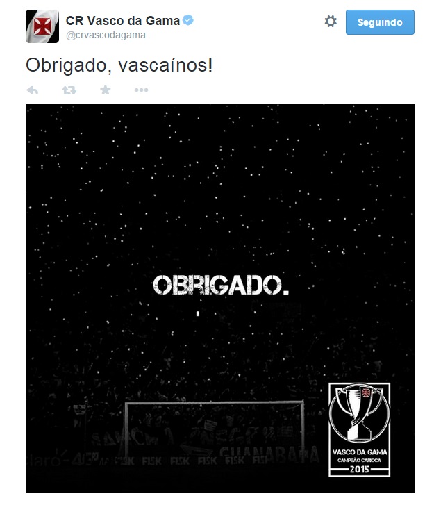 Vasco agradece torcedores por meio de suas redes sociais: 'Obrigado'