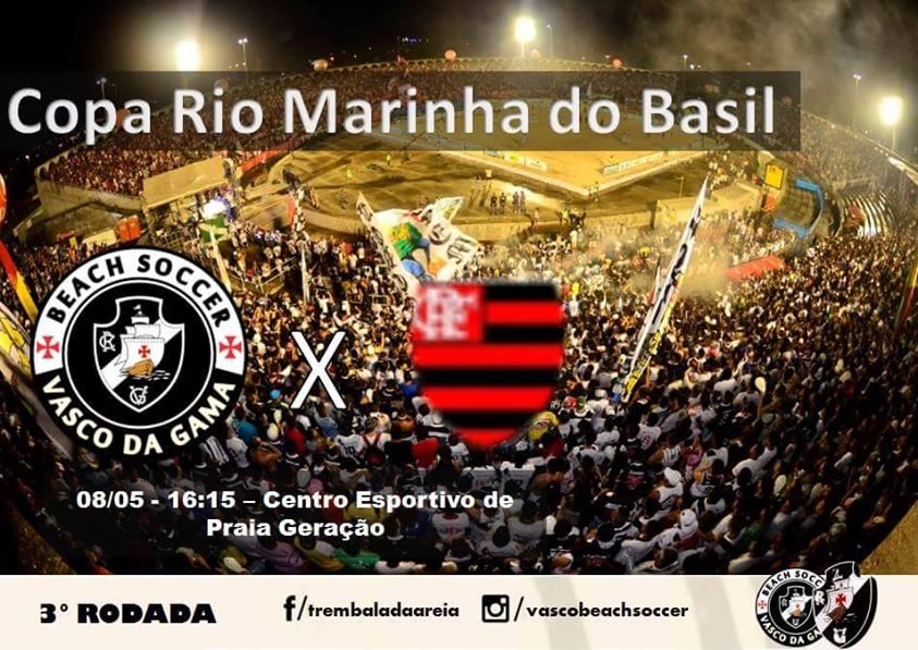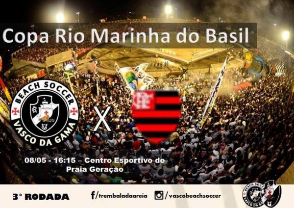 O time de Beach Soccer do Vasco enfrenta, às 16h15 desta 6ª-feira (08/05), o Flamengo pela Copa Rio Marinha do Brasil. Acompanhe em tempo real pelo Facebook Vasco Beach Soccer clicando aqui.