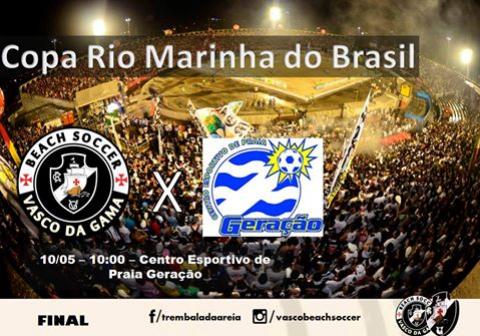 O time de Beach Soccer do Vasco enfrenta, às 10h deste domingo (10/05), o Geração na final Copa Rio Marinha do Brasil. Acompanhe em tempo real pelo Facebook Vasco Beach Soccer clicando aqui.