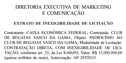 O Diário Oficial da União publicou, nesta sexta-feira, a autorização para a renovação de contrato entre a Caixa Econômica Federal e o Vasco, um dia depois de a presidente do banco, Miriam Belchior, afirmar que o acordo estava selado. A assinatura deve ocorrer na próxima semana.