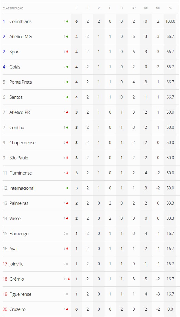 Terminada a 2ª rodada do Campeonato Brasileiro 2015, o Vasco, que empatou com o Figueirense por 0 a 0, está na 14ª colocação. O desempate contra o Palmeiras, 13º colocado, se dá no critério de gols marcados.