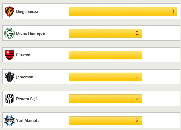Nenhum jogador vascaíno marcou gols no Brasileiro até o momento. O artilheiro da competição é Diego Souza, do Sport, com 3 gols.