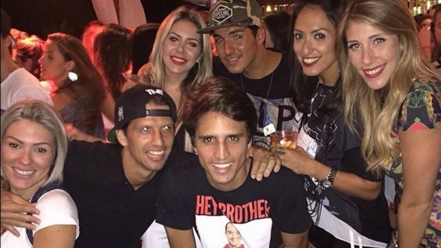O jogador posou para foto muito bem acompanhado, cercado de quatro mulheres e ao lado de Gabriel Medina, atual campeão mundial de surfe.