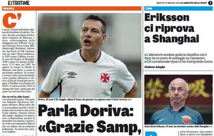 "Há um pouco da Itália na última revelação de treinadores no futebol brasileiro". É assim que um dos principais diários esportivos abre a página para Doriva. O técnico do Vasco, que fez história como primeiro treinador a vencer consecutivamente os campeonatos estaduais de São Paulo e do Rio, ganhou destaque em entrevista no Gazzeta Dello Sport. Com origens italianas na família, o jovem treinador de 42 anos lembrou os tempos de Sampdoria e citou as influências da escola europeia no seu modo de ver o jogo e de treinar suas equipes.