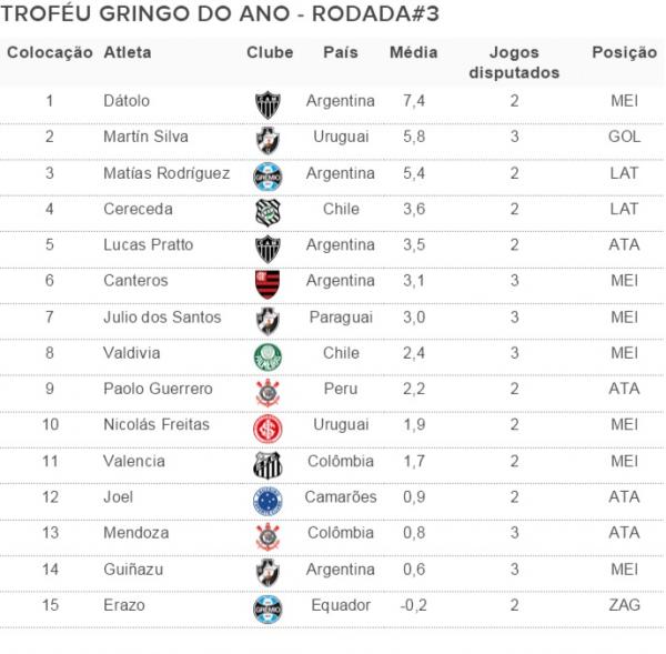 Com representantes nas primeira, terceira, quinta e sexta colocações, os argentinos estão mandando no Troféu Gringo do ano. O meia Jesús Dátolo, do Atlético-MG, manteve a liderança com média de 7,4 pontos em duas partidas disputadas.