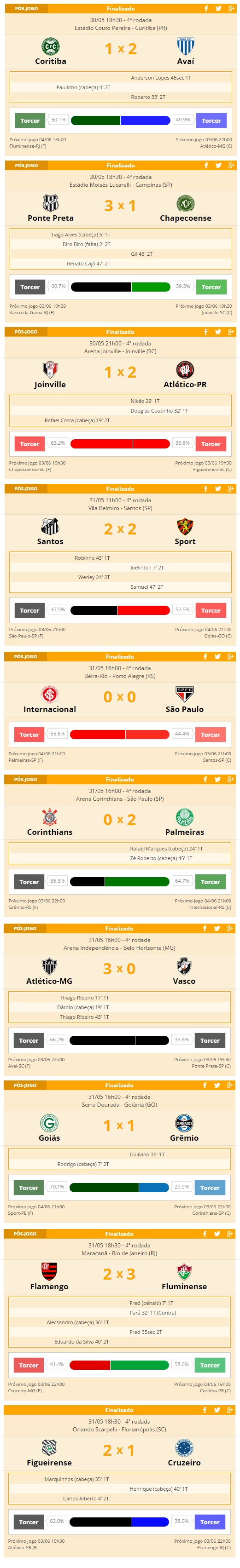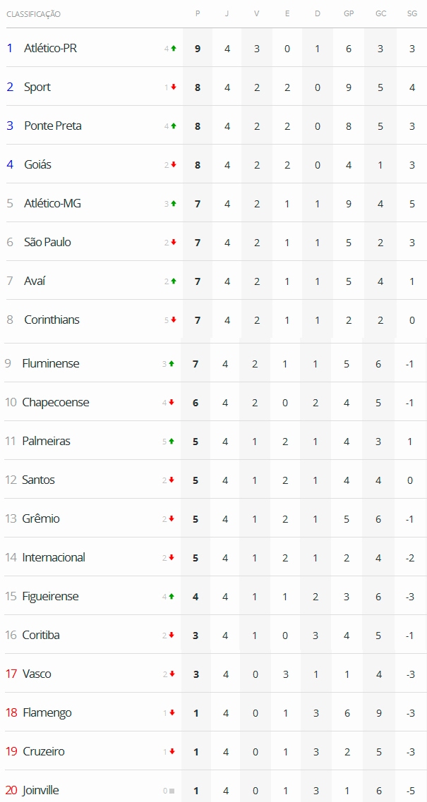 Terminada a 4ª rodada do Campeonato Brasileiro 2015, o Vasco, que perdeu para o Atlético Mineiro por 3 a 0, caiu para a 17ª colocação e está na zona de rebaixamento. O Coritiba, primeiro clube fora do Z-4, tem a mesma pontuação do Vasco, mas leva vantagem por ter uma vitória.