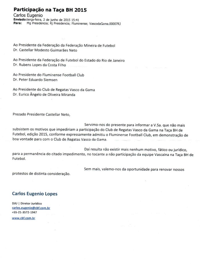 O pedido assinado pelo Diretor Jurídico da CBF, Carlos Eugenio Lopes, está endereçado ao presidente da FMF, Castellar Modesto, ao presidente da Ferj, Rubens Lopes, e aos mandatários de Fluminense e Vasco, Peter Siemsen e Eurico Miranda, respectivamente. Carlos Eugenio alega que "em demonstração de boa vontade", o Fluminense teria admitido que "não mais subsistem os motivos que impediriam a participação" do Vasco no torneio.