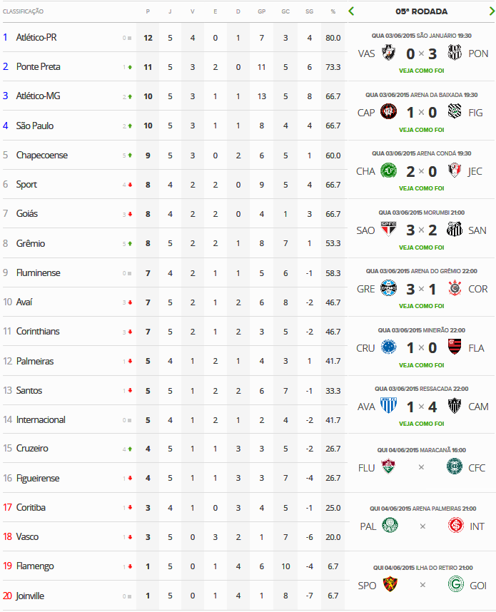 Vasco terminará a 5ª rodada do Brasileiro na 18ª colocação; veja classificação parcial