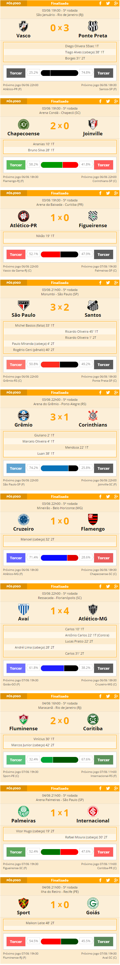 Terminada a 5ª rodada do Campeonato Brasileiro, o Vasco, que perdeu para a Ponte Preta por 3 a 0, caiu da 17ª para a 18ª colocação e segue na zona do rebaixamento.