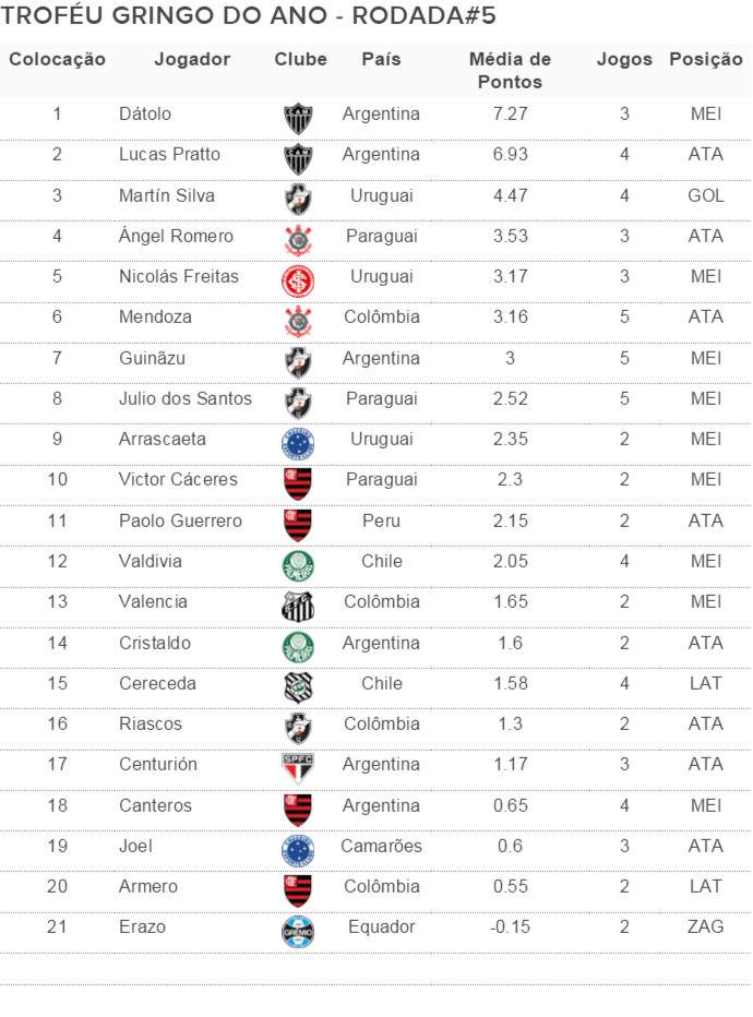 O atacante Ángel Romero, do Corinthians, marcou 1,10 ponto na rodada#5, e sua média caiu de 4,75 para 3,53. Com isso, perdeu a terceira colocação para o goleiro uruguaio Martín Silva, do Vasco, que também não jogou.
