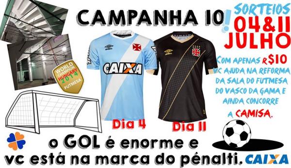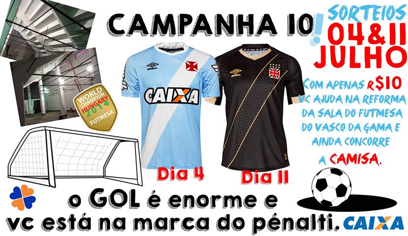 A Divisão de Futebol de Mesa do CR Vasco da Gama promove a Campanha 10! onde serão sorteadas pela Loteria Federal 2 (duas) camisas oficiais do CR Vasco da Gama para ajudar na reforma da nova sala do departamento em São Januário. Além de já contar com o apoio da Cia. do Doce o departamento promove esta ação devido a dimensão da obra e pede a ajuda de todos !!! Serão dois sorteios distintos, o primeiro no dia 04/07 (camisa de goleiro) e o segundo no dia 11/07 (camisa nº 3). Para concorrer a cada sorteio, vc só precisa contribuir com R$ 10,00 (Dez Reais) e indicar qual sorteio pretende concorrer. Será permitida a compra de mais de uma numeração para cada sorteio ou a compra para as duas datas.