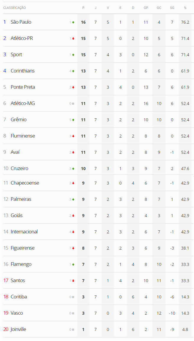 O Gigante da Colina está a 13 pontos do líder (São Paulo), a 10 pontos do G4 (Corinthians, 4º colocado) e a 4 pontos do 1º time fora da zona do rebaixamento (Flamengo, 16º colocado).