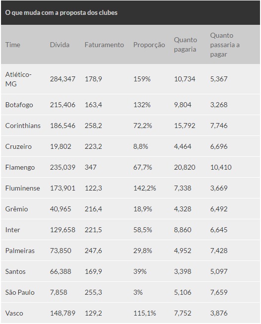 Considerando apenas os 12 gigantes nacionais (Atlético-MG, Botafogo, Corinthians, Cruzeiro, Flamengo, Fluminense, Grêmio, Internacional, Palmeiras, Santos, São Paulo e Vasco), a União também receberia um pagamento anual bem menor que o previsto. Juntas, estas equipes colocariam R$ 103,048 milhões por ano nos cofres do Governo Federal pela regra antiga. Na nova proposta, eles pagariam R$ 74,353 milhões.
