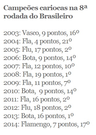 Nem sempre ser campeão carioca significa ter sucesso no Brasileirão. Flamengo e Botafogo, cada um duas vezes (em 2004 e 2014, e 2006 e 2013, respectivamente), tiveram um começo de nacional preocupante após vencerem o Estadual, caso do Vasco em 2015 (relembre no vídeo abaixo). O problema cruz-maltino é a possibilidade de bater um recorde negativo: só vitória diante do Sport, sábado, no Recife, evita que o clube de São Januário se isole como o pior fluminense vencedor nas rodadas iniciais da disputa tupiniquim. Sem falar, claro, no alívio de uma crise que não acaba.