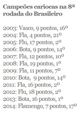 O levantamento do GloboEsporte.com leva em consideração apenas os torneios de pontos corridos, implantados pela CBF em 2003. De lá para cá, nas sete primeiras rodadas, Vasco e Flamengo têm o pior rendimento. São três pontos, neste ano e em 2004, respectivamente, com ligeira vantagem rubro-negra: -7 a -12 no saldo de gols. Se o recorte de análise for à oitava rodada, a ser disputada no próximo final de semana, o Fla, com quatro pontos, é o lanterna. Daí a necessidade vascaína de ganhar.