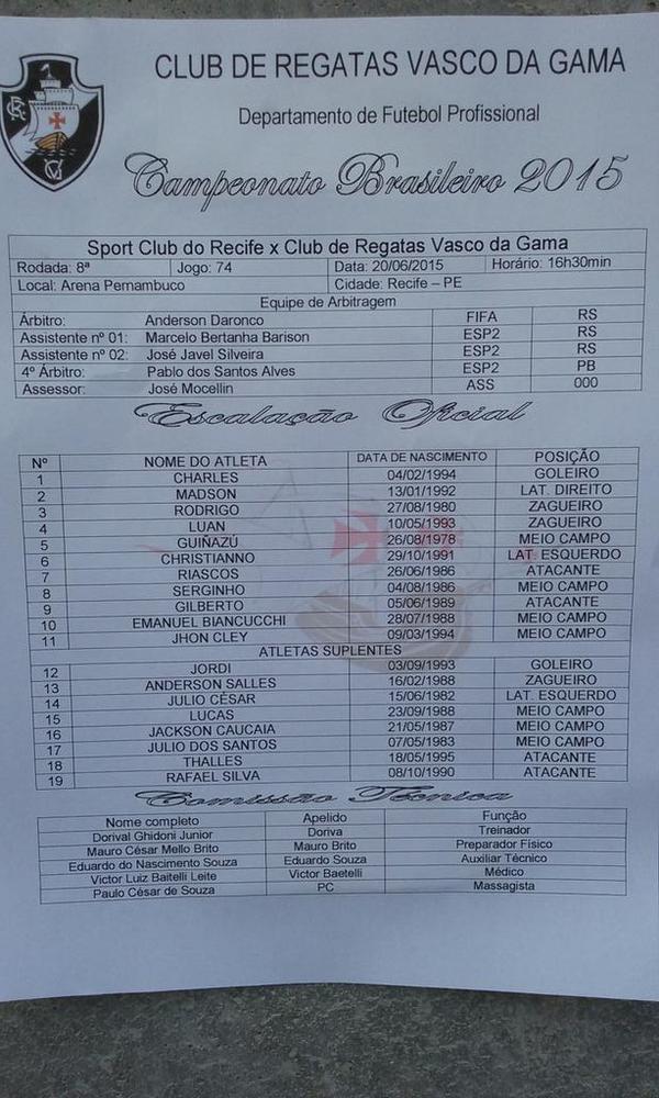 Suplentes do Vasco: Jordi, Anderson Salles, Julio César, Lucas, Jackson Caucaia, Julio dos Santos, Thalles e Rafael Silva.