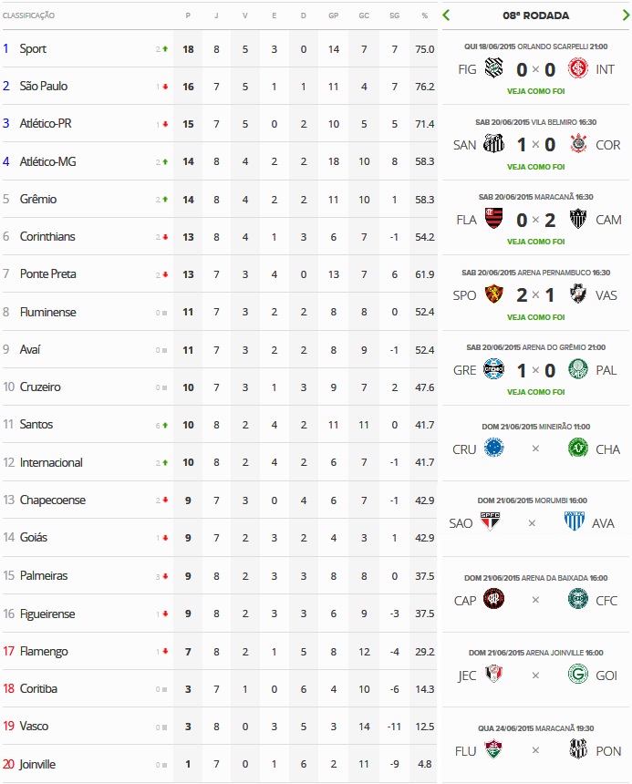 A derrota para o Sport (2 a 1) manteve o Vasco na penúltima posição do Campeonato Brasileiro. Se o Joinville vencer o Goiás neste domingo (21/06), o Gigante da Colina terminará a 8ª rodada na lanterna da competição.