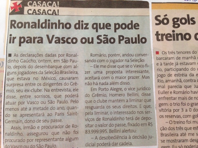 - 21/06/15Vasco faz proposta por Ronaldinho Gaúcho, mas jogador e empresário querem salário alto, diz jornalista